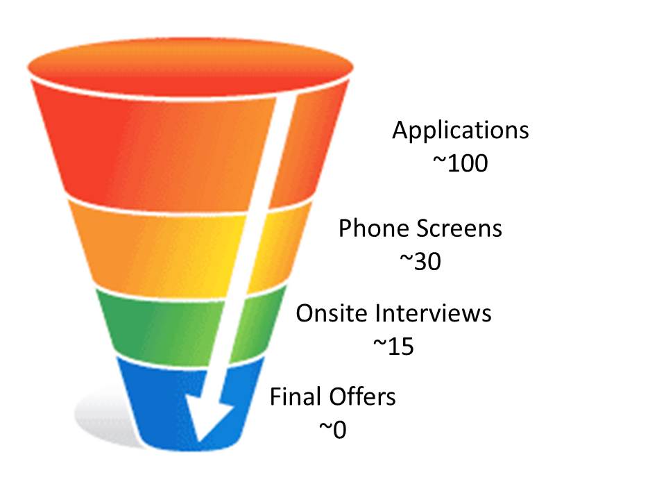 Write it down. It’ll help you see where you get traction and where you don’t.  It’ll also help avoid the awkward moments of not remembering when or if you applied for a position previously (sorry Brightroll, I thought the third would definitely be the charm!).  You can also calculate your own Career Funnel: